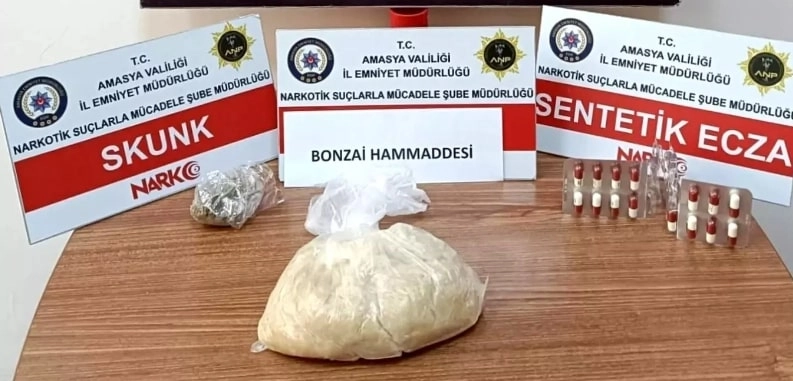 İl Emniyet Müdürlüğü Narkotik Suçlarla Mücadele Şube ekiplerinin batı illerinden Karadeniz illerine uyuşturucu madde sevk eden şahısların tespiti ve yakalanmasına yönelik yapılan çalışmalar neticesinde Gümüşhacıköy ilçesinde hedef 2 araç ve içerisinde bulunan şüpheliler M.Ö., M.A. ve Ş.K.'nın üzerinde arama yapıldı. Aramalarda, 494,65 gram bonzai ham maddesi, 9,31 gram esrar ve 15 adet uyuşturucu hap ele geçirildi. Gözaltına alınan 3 şahıs çıkarıldıkları mahkemede tutuklandı.