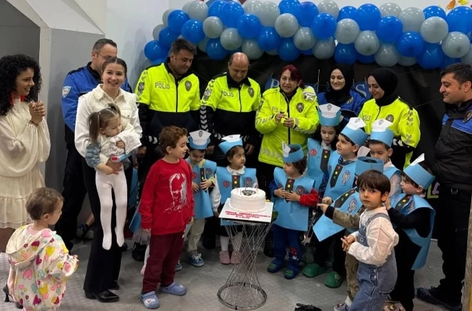 Polis Haftası kapsamında anaokuluna davet edilen polisler pasta sürprizi ile karşılaştı. Toplum Destekli, Asayiş Şube Müdürlüğü ve Trafik Tescil Denetleme Şube Müdürlüğü ekipleri öğrencilere eğitim vermek üzere anaokuluna gitti. Anaokulu yönetimi ve minik öğrenciler, polislerin hem polis haftasını hem de polis teşkilatının 180. Kuruluş yıldönümünü yaptırdıkları pasta ile kutladı. Pastanın mumları polisler tarafından yakıldı, minik öğrenciler tarafından üflenerek hem polis haftası hem de emniyet teşkilatının 180. Kuruluş yıldönümü kutlandı.