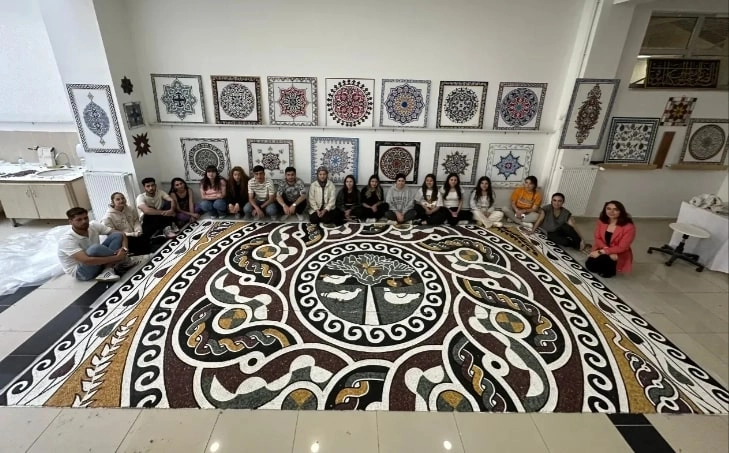 Tasarım Meslek Yüksekokulu Müdürü Dr. Öğr. Üyesi Feyza Aykutlu, Doç Dr. Fazilet Koçyiğit, Öğr. Gör. Lale Yılmaz’ın ve Mimari Restorasyon Bölümü ikinci sınıf öğrencilerinin aralarında bulunduğu ekip tarafından hazırlanan mozaik, yakın zamanda duvarları süsleyeceği Tarihi Taşhan’a nakledilmek için gün sayıyor.