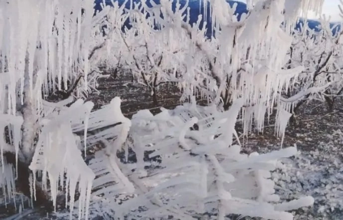Kentte 1 haftadır etkili olan soğuk hava, meyve yetiştiricilerinin faaliyetlerini de olumsuz etkiledi. Hava sıcaklığının eksi 9 dereceye kadar düşmesi sonucu, çiftçi, ağaçların zarar görmesini önlemek amacıyla fıskiyeyle su sıktı. Yaşanan don sonucu ağaçların dallarında sarkıtlar oluştu.