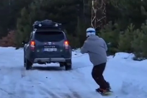 Doğa gezginlerinin araba arkasında snowboard yaptığı anlar cep telefonu kameralarıyla kaydedildi. Sosyal medyada paylaşılan görüntüler kısa sürede ilgi gördü.