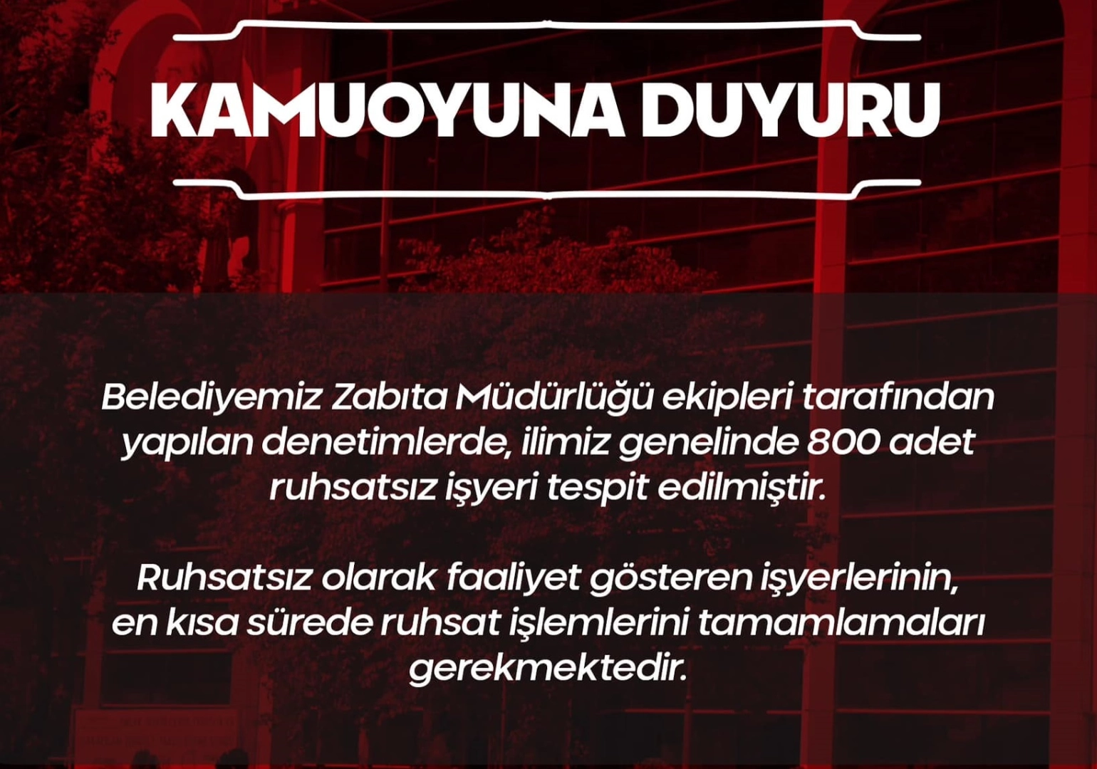 Sayıştay Denetimleri sonrasında, Vergi Dairesine kayıtlı esnaf sayısı ile Amasya Belediyesi’ne kayıtlı esnaf sayısının tutmaması nedeniyle, Zabıta Müdürlüğü Ekipleri tarafından il genelinde yapılan denetimler sonucunda, 800 iş yerinin ruhsatsız çalıştığı belirlendi. Amasya Belediye Başkanı Av. Turgay Sevindi, Ruhsatsız olarak faaliyet gösteren işyerlerinin en kısa sürede yasal ücretlerini ödeyerek, ruhsat işlemlerini tamamlayabileceklerinin altını çizdi.