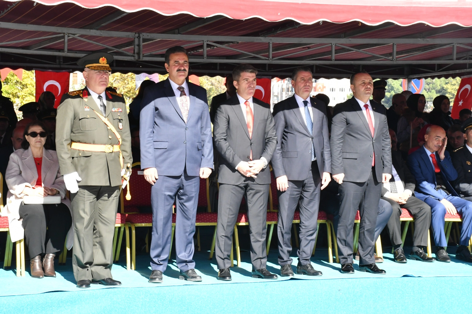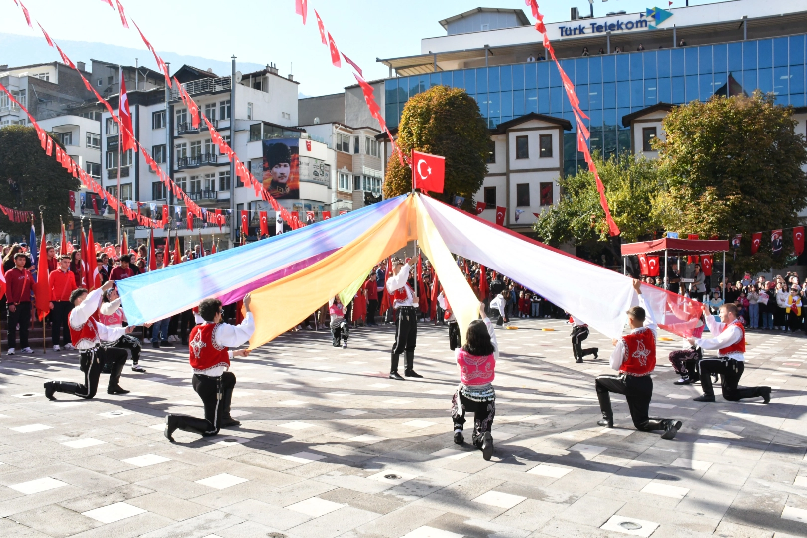 Halk oyunu gösterisi yapılan tören askeri birlikler ile kamu kurumlarına ait araçların geçişinin ardından sona erdi.