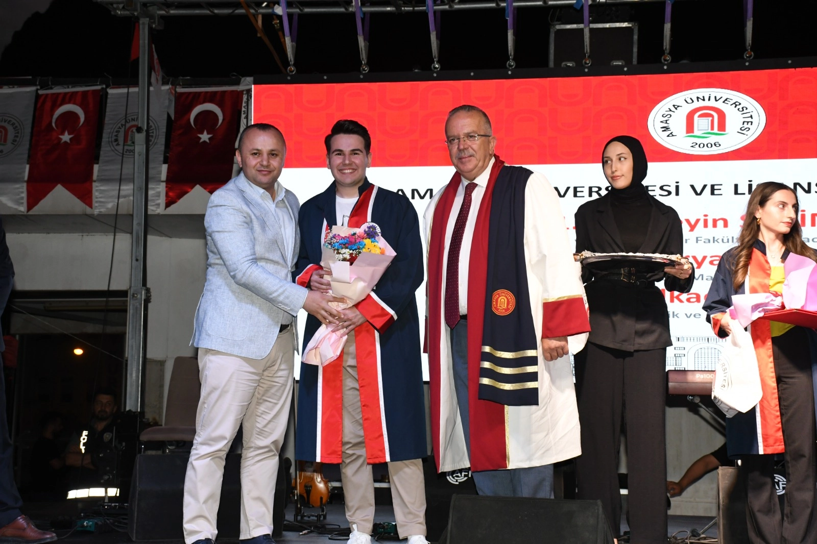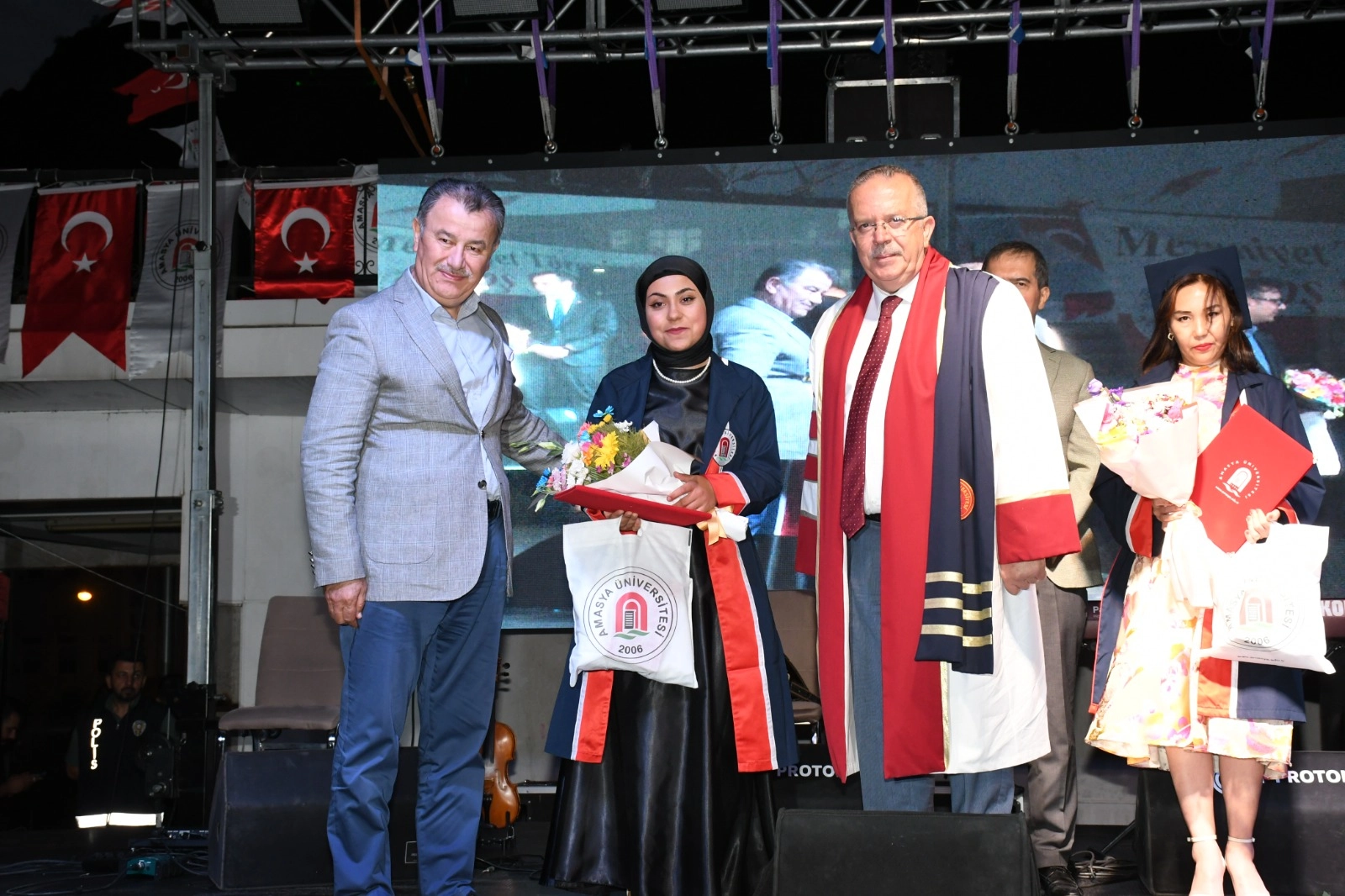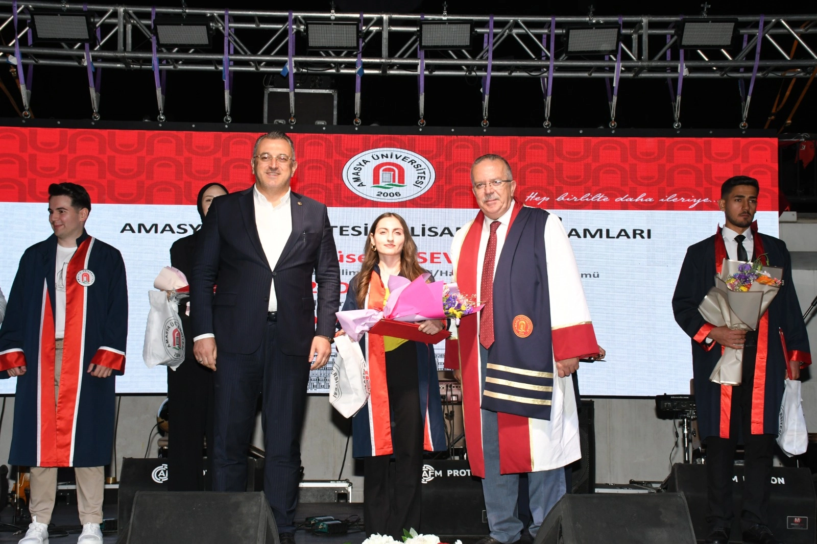 Amasya Valisi Yılmaz Doruk, Amasya Milletvekili Hasan Çilez, Amasya Belediye Başkanı Av. Turgay Sevindi, Gümüşhacıköy Kaymakamı Baha Büyükkaymakcı, İl Emniyet Müdürü Ali Kemal Kurt, Polis Meslek Eğitim Merkezi Müdürü Süleyman Gül ve Amasya Üniversitesi Rektörü Prof. Dr. Ahmet Hakkı Turabi bölümlerini derece ile bitiren öğrencilere diploma ve ödüllerini takdim ettiler. Mezuniyet töreni, Amasya Üniversitesi Halkoyunları Topluluğu, üniversitemizin son dönemde gerçekleştirmiş olduğu faaliyetleri içeren sinevizyon gösterisi, üniversite öğrencilerinin Taekwon-do gösterisi, kep atma töreni ve Amasyalı ses sanatçısı Ethem Kaya’nın verdiği konserle sona erdi.