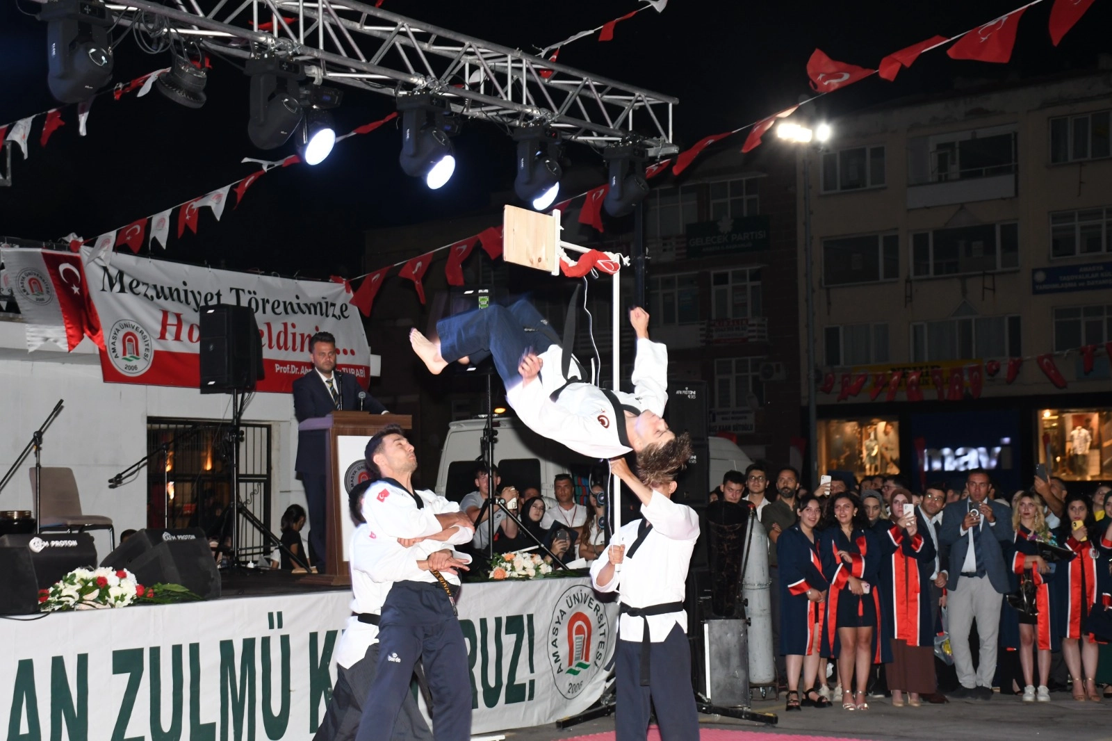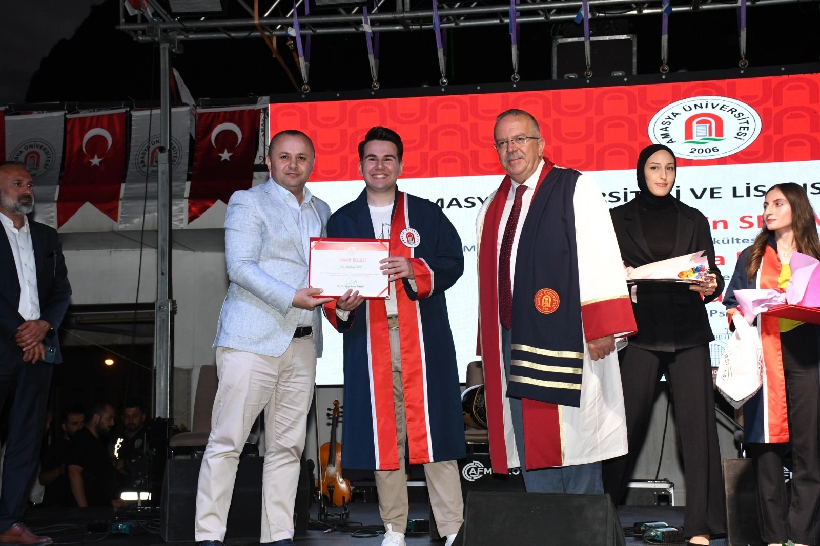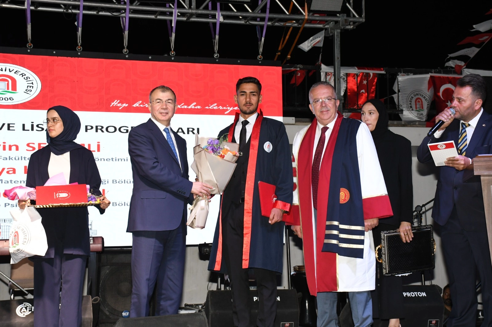 Amasya Valisi Yılmaz Doruk, Amasya Milletvekili Hasan Çilez, Amasya Belediye Başkanı Av. Turgay Sevindi, Gümüşhacıköy Kaymakamı Baha Büyükkaymakcı, İl Emniyet Müdürü Ali Kemal Kurt, Polis Meslek Eğitim Merkezi Müdürü Süleyman Gül ve Amasya Üniversitesi Rektörü Prof. Dr. Ahmet Hakkı Turabi bölümlerini derece ile bitiren öğrencilere diploma ve ödüllerini takdim ettiler. Mezuniyet töreni, Amasya Üniversitesi Halkoyunları Topluluğu, üniversitemizin son dönemde gerçekleştirmiş olduğu faaliyetleri içeren sinevizyon gösterisi, üniversite öğrencilerinin Taekwon-do gösterisi, kep atma töreni ve Amasyalı ses sanatçısı Ethem Kaya’nın verdiği konserle sona erdi.