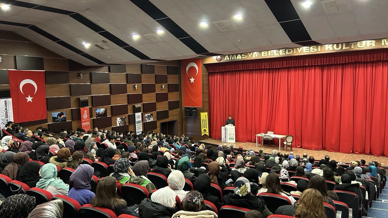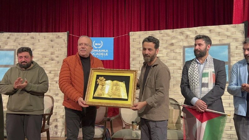 Amasya İHH ve Özgür-Der Temsilciliklerinin organize ettiği, “Bu Benim Meselem Değil, Parola Boykot” konulu tiyatro oyunu Vodvil Sahne ekibi tarafından Amasya Belediyesi Kültür Merkezinde sahnelendi.40’a yakın şehirde 70’in üzerinde oyun oynayan “Vodvil Sahne” ekibi “Bu Benim Meselem Değil, Parola Boykot” oyunuyla Amasya’da izleyicilerin karşısına çıktı. Burak Kılıç’ın yönetmenliğini ve senaristliğini yaptığı oyunun genel sanat yönetmenliğini sanatçı Seyfullah Şenel üstleniyor. ‘Boykot Müslümanlar için vazgeçilmez bir sorumluluktur’ Kuran-ı Kerim, sinevizyon gösterimi ve açılış konuşmasının ardından oynanan oyun yoğun katılımla gerçekleşti. Anlamlı mesajların verildiği oyunda komedinin yanında duygusal anlar yaşandı. Marka zincirleri tarafından esaret altına alınan insanların tedavi gördüğü hayali hastanede, Filistinli eski gazeteci Yasin’in hikâyesinin anlatıldığı oyunda izleyiciler gözyaşlarını tutamadı. Bu poşete kaç bebek sığar! Gazze’de yaşanılan katliamları gündemden düşürmemek adına yapılan oyunda marka ürünlerin insanları adeta bağımlı hale getirdiği mesajı verildi. Tiyatronun son sahnesinde Gazze’de yaşanılan acıları anlatan bölümde Yasin rolündeki oyuncunun elindeki poşetleri göstererek Gazze’de bebeklerinin cesetlerini poşete koyan anne babaları hatırlatarak “Bu poşete kaç bebek sığar!” söylemi yürekleri dağlarken, Siyonist zalimlere destek veren firmalara karşı boykotun Müslümanlar için vazgeçilmez bir sorumluluk olduğu hatırlatıldı. Amasya Üniversitesi Rektörü Prof. Dr. Ahmet Hakkı TURABİ’nin “Vodvil Sahne” Tiyatro Ekibine hediye takdiminin ardından program son buldu. Haber: Sinan HARMANCI